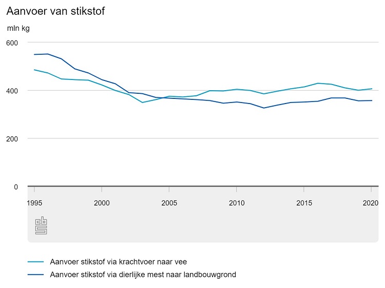 Het grootste deel van de via krachtvoer aangevoerde stikstof komt uiteindelijk terecht in dierlijke mest. De aanvoer van stikstof in dierlijke mest naar landbouwgrond daalde tot 2012 met 41 procent, om daarna weer te stijgen. In 2020 lag de aanvoer 35 procent lager dan in 1995.