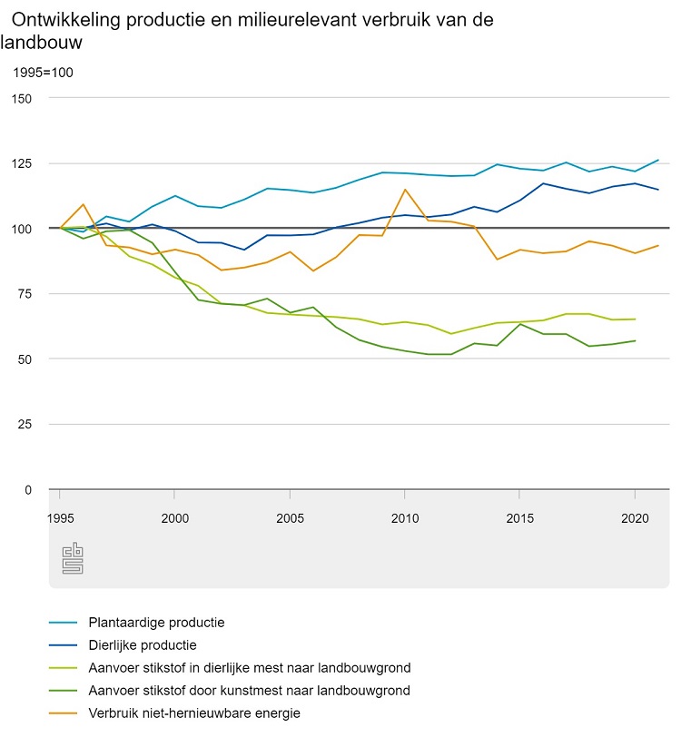De plantaardige en de dierlijke landbouwproductie zijn beide sinds 1995 gestegen. De stijging van de plantaardige productie kwam tot stand ondanks verminderd gebruik van (kunst)mest. De hoeveelheid via dierlijke mest naar landbouwgrond aangevoerde stikstof daalde tot 2012 met 41 procent en nam daarna weer iets toe. De via kunstmest aangevoerde stikstof daalde volgens een vergelijkbaar patroon. Het verbruik van niet-hernieuwbare energie door de landbouw, zoals aardgas, lag in 2021 na diverse pieken en dalen iets lager dan 25 jaar geleden.