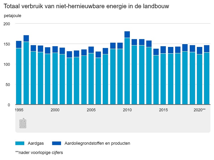 Een belangrijke vorm van milieurelevant verbruik betreft het verbruik van niet-hernieuwbare energie. Bij de landbouw gaat het hierbij voor het grootste deel om aardgas. De glastuinbouw verbruikt het meeste aardgas. Tot 2005 werden kassen meestal verwarmd met gasgestookte ketels en verlicht met elektriciteit uit het net. Sinds 2006 wekken steeds meer tuinders zelf elektriciteit en warmte op uit aardgas via warmtekrachtkoppeling (WKK). Een deel van deze elektriciteit leveren ze terug aan het openbare net. De niet-hernieuwbare energie die de landbouw verder verbruikt is vooral aardolie, met name als brandstof voor tractoren.
