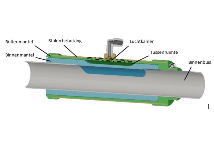 Als het ASC-systeem geactiveerd is en de slangafsluiter zich sluit, dan zal de luchtkamer tussen de stalen behuizing (geel) en de buitenmantel 1 (groen) gevuld zijn met lucht. De buitenmantel (groen) zal daardoor tegen binnenmantel (blauw) geduwd zijn.