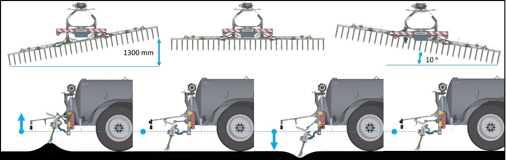 Door middel van dit nieuw ontwikkelde bodemaanpassingssysteem kan de sleepvoetbemester zich volledig vrij van de bewegingen van de tank; aanpassen aan de bodemcontour waardoor een optimale mestafgifte altijd gewaarborgd is. Bovendien creëert de ingebouwde kinematica altijd de optimale hoek van de sleepvoeten ten opzichte van de bodem. De actieve druk blijft op de sleepvoeten maximaal.