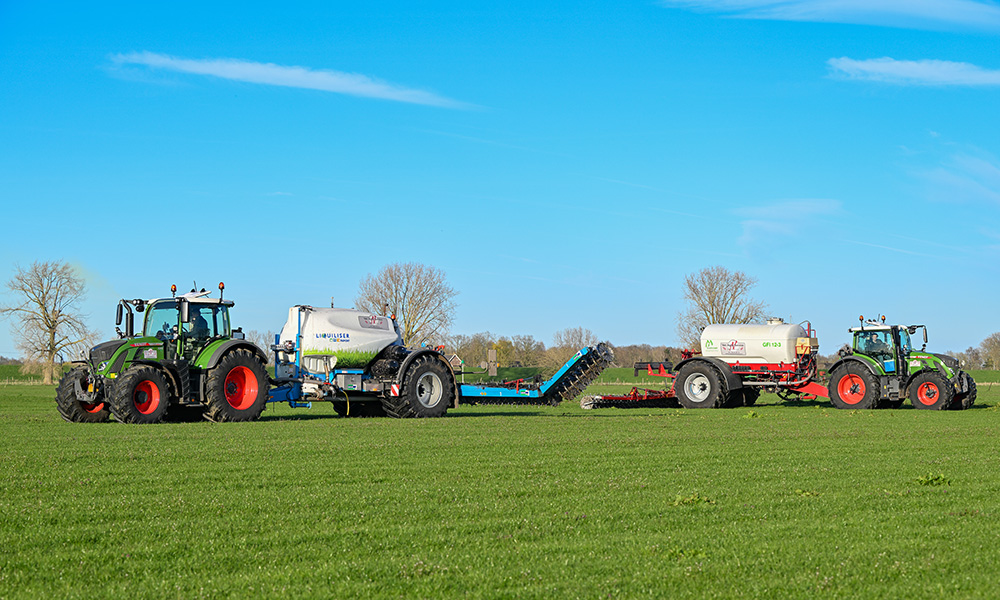 Ploegmakers laat op 75 hectare grasland urean en spuiwater uitrijden met een verhouding van 1:10 per hectare. Voor de 12 hectare pas ingezaaid grasland is het nog te vroeg om nu ook hier al te spaakwielbemesten. Verder heeft Ploegmakers nog 30 hectare maïsland en 10 hectare natuurgrasland in beheer. Ven Agra Service is bezig met twee spaakwielbemesters op de 22 hectare grote huiskavel van de melkveehouder. Volgens loonwerker Niek van der Ven is dat, met de twee capaciteitsmachines, binnen anderhalf uur gepiept.