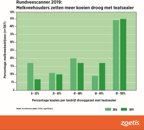 Om de manier van droogzetten te inventariseren ondervroeg Zoetis 560 melkveehouders met meer dan tachtig koeien in De Rundveescanner 2019. Niet alleen het aantal melkveehouders dat teatsealers gebruikt steeg (69% nu v.s. 59% in 20141), maar ook het aantal koeien per bedrijf dat wordt drooggezet met een teatsealer.