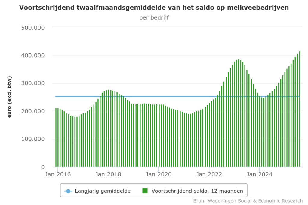 Het voortschrijdend jaarsaldo herstelde zich sterk na de dip in 2023 en lag in augustus 2025 maar liefst 65% boven het langjarig gemiddelde. Daarmee ligt het zelfs iets hoger dan de piek van maart 2023. De melkprijs bevond zich in augustus op ongeveer hetzelfde niveau als het hoge jaargemiddelde van 2022, terwijl de kosten 10% lager lagen.
