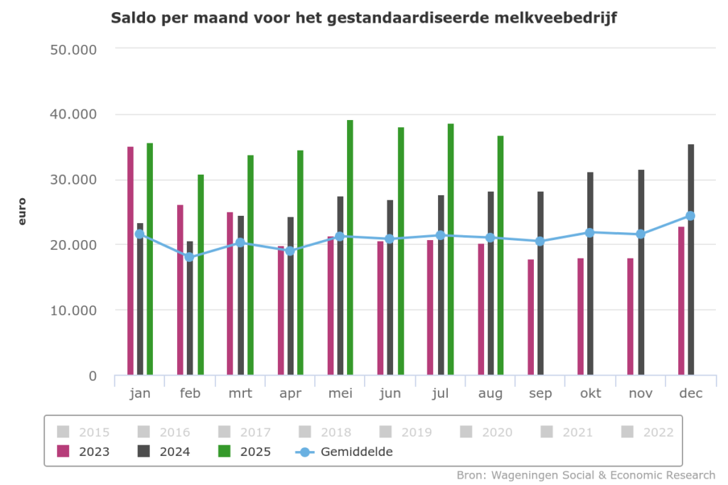 Het maandsaldo van het gestandaardiseerde melkveebedrijf kwam in augustus 2025 uit op 36.900 euro. Dat is ruim 31% hoger dan in dezelfde maand van 2024 en 75% boven het langjarig gemiddelde voor augustus. De sterke resultaten zijn vooral te danken aan de relatief hoge melkprijs en gunstige opbrengsten voor slachtkoeien en kalveren.