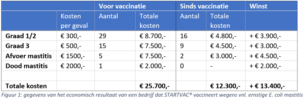 Kijkend naar de resultaten van het bedrijf, is te zien dat het aantal ernstige graad 3 uierontstekingen (die niet afgevoerd/dood zijn) daalde van 15 naar 9 koeien en het aantal vroegtijdig afgevoerde koeien door mastitis daalde van 5 naar 2 koeien. In het jaar voorafgaande aan vaccinatie stierf er één koe ten gevolge van mastitis. Sinds vaccinatie is er geen koe meer gestorven door mastitis.