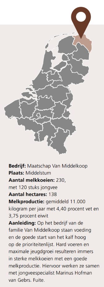 Maatschap van Middelkoop in Middelstum heeft zo’n 230 koeien aan de melk. Maar voordat de dieren zo ver zijn, hebben ze op dit bedrijf al ruimschoots speciale aandacht en verzorging achter de rug. Door hard voeren, nauwkeurig werken en geleidelijke veranderingen doorvoeren wordt het jongvee voorbereid op het leveren van een topproductie. Om de jeugdgroei maximaal te kunnen benutten, spart de familie Van Middelkoop regelmatig met jongveespecialist Marinus Hofman van Gebrs. Fuite.