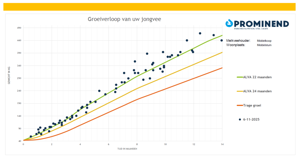 Inmiddels staat de jongveeopfok bij Van Middelkoop dus als een huis. “De kalveren zijn daadwerkelijk ‘robuuster’ geworden. Er zit meer rug in, in plaats van dat de rug te zien is”, aldus Henderik. Dat blijkt ook uit een recente weergave van het groeiverloop van het jongvee, waarbij het gewicht van de kalveren is bepaald aan de hand van de borstomvang (zie foto). De dieren behalen de gewenste groei van ruim 1 kilogram per dag en de gemiddelde afkalfleeftijd ligt momenteel op 22,8 maanden. Het streven is 22 maanden. Ook is te zien dat de groei van de groep dicht bij elkaar ligt. Een mooie stabiele groei! “Voorheen was er meer spreiding te zien. De grafiek had meer een S-vorm, waarbij de kalveren tijdens de overgang van melkpoeder naar het melkveerantsoen duidelijk een dip hadden in de groei”, legt Hofman uit. Hij komt gemiddeld eens per anderhalve maand langs om te sparren over de gehele jongvee opfok.