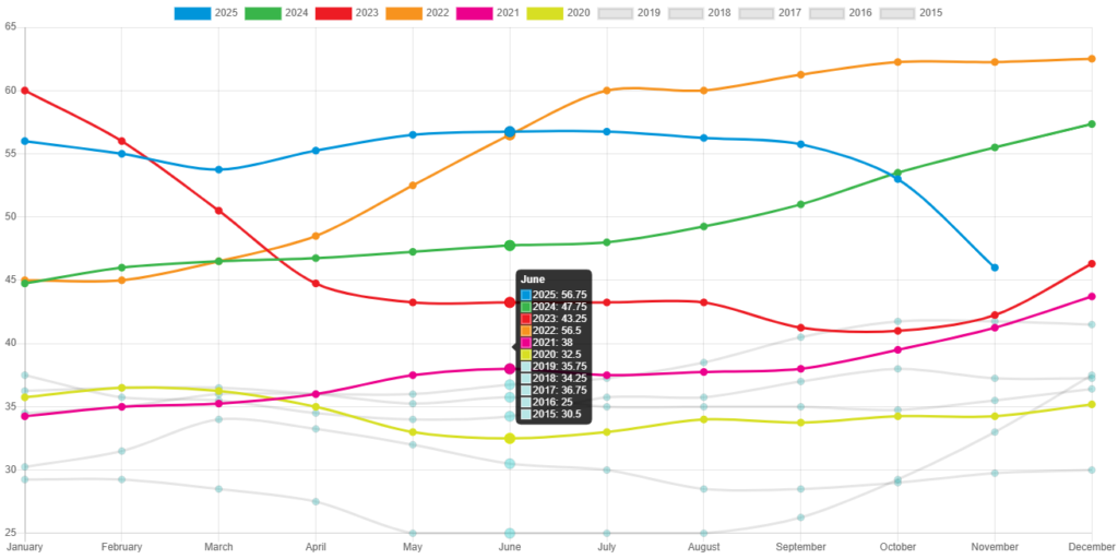 De Garantieprijs voor november daalt met 7,00 euro ten opzichte van vorige maand. De daling is vooral gedreven door de verwachting dat de referentieondernemingen hun vergoeding voor gangbare boerderijmelk zullen verlagen, in lijn met de recente sterke daling van de prijzen voor basiszuivelproducten. Daarnaast is de daling toe te schrijven aan een negatieve correctie vanwege een te hoge inschatting van de referentieprijzen voor boerderijmelk in de afgelopen periode.