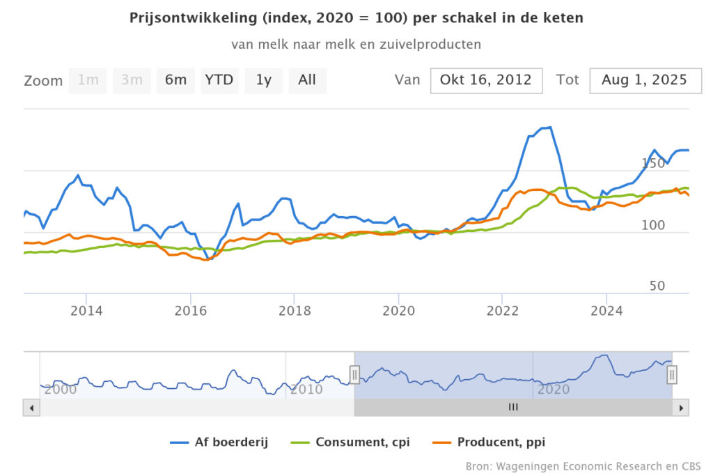 De zuivelmarkt laat in de zomer van 2025 opnieuw een stabiel beeld zien. Terwijl de af-boerderijprijzen licht stijgen en lijken te stabiliseren, bewegen de consumenten- en producentenprijzen slechts beperkt. Daarmee blijft het prijsniveau in de hele keten relatief hoog vergeleken met voorgaande jaren.