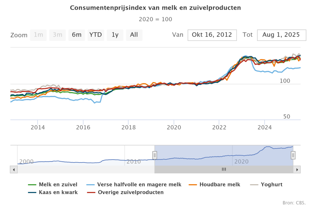 De consumentenprijsindex (CPI) voor zuivel kwam in juli 2025 uit op 136 punten (2020=100), een stijging van 2% ten opzichte van mei. Deze beperkte stijging is een vertraagd effect van hogere af-boerderijprijzen eerder dit jaar.