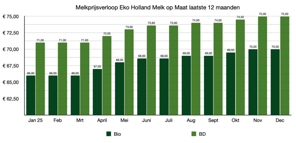 De te verwachten melkprijs voor de maand december 2025 komt voor biologische melk uit op €70,00 per 100 kg. Voor biologisch-dynamische melk bedraagt de verwachte uitbetaling €75,00 per 100 kg.