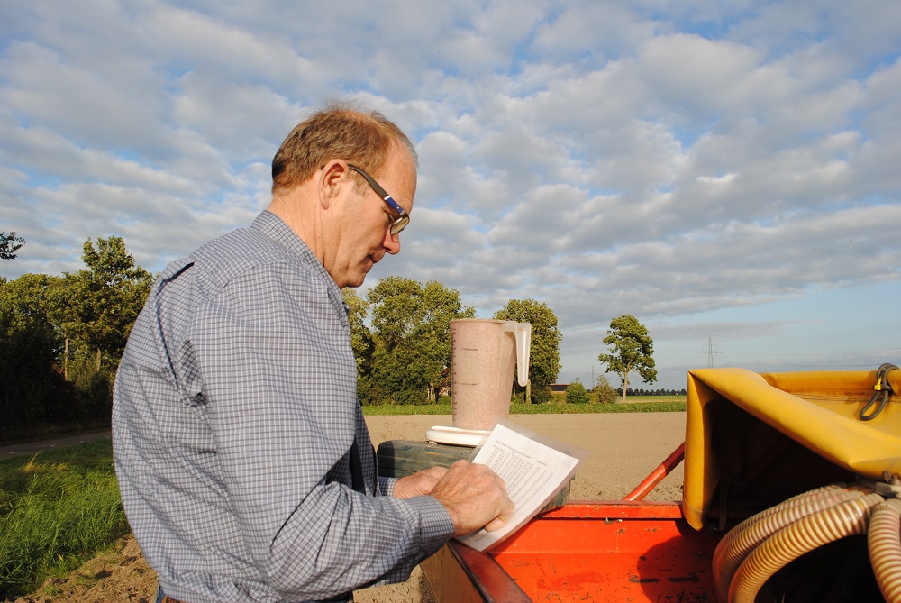 De verstelling van de pneumatische zaaimachine gebeurt rechtevenredig. “Ik draai nooit zelf af. Voor het wegen van het zaad maak ik gebruik van een tabel, die ook ooit van een zzp’er kreeg. Met een keukenweegschaal en een maatbeker bepaal ik het brutogewicht per hectare. Ik zaai tot een kilo leeg. Dat werkt ontzettend goed.”