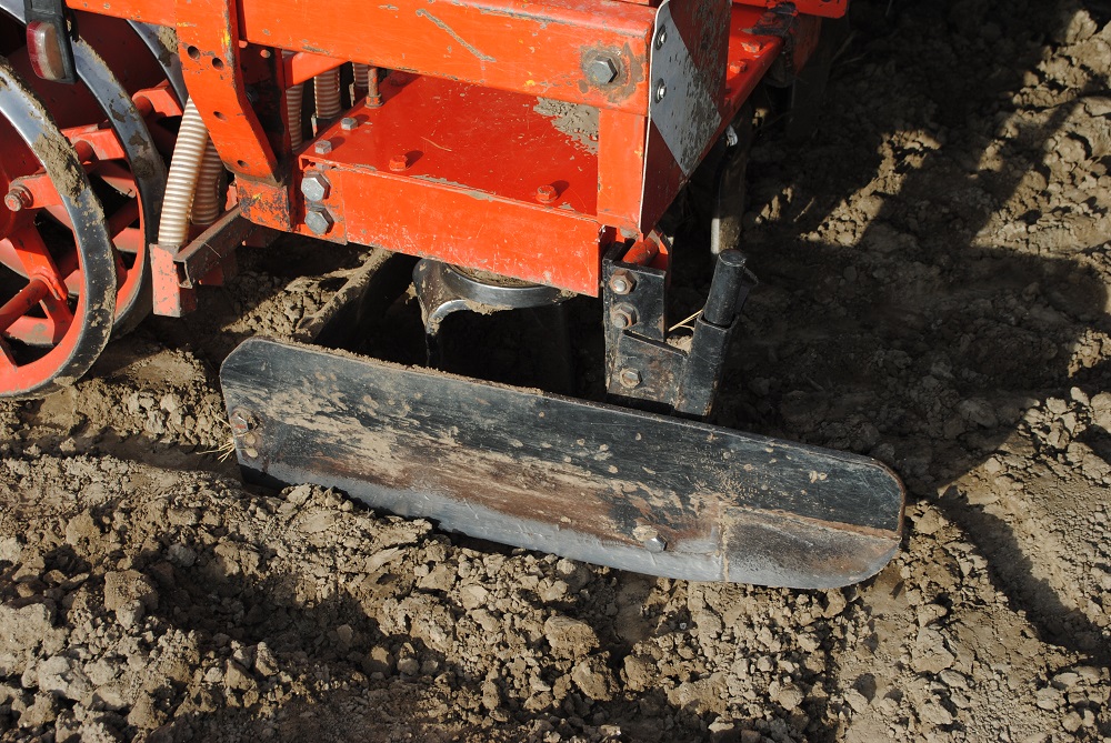 De basis van de zaaimachine is een Samex-TwinSeeder met rotorkopeg. De Lange heeft de egalisatiebalk voor de ringenrollen aan de zijplaats vastgemaakt. “Wat je vaak ziet, is dat op de scheiding een ruggetje grond ontstaat. De ruggetjes moet je vervolgens weer aanrijden, om te voorkomen dat er grond in de kuil komt. Door de egalisatiebalk zo uit te voeren, voorkom je dat.” De rollen zijn normaliter in het midden gelagerd. “Nu heb ik de ringen op één lange buis gemonteerd. Dit zijn overigens al een tweede stel ringen. Ik werk veel op zand en je ziet dat dit behoorlijk aanvreet.”