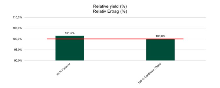 In bijna alle proeven was de opbrengst van de 75 procent Pudama-percelen bijna gelijk of zelfs hoger dan bij de conventionele manier van strookbemesting.