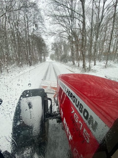 Ook loonbedrijf te Riet uit Haaksbergen (OV) is druk met de sneeuw. Met een Massey Ferguson 7615 wordt de weg vrijgemaakt.