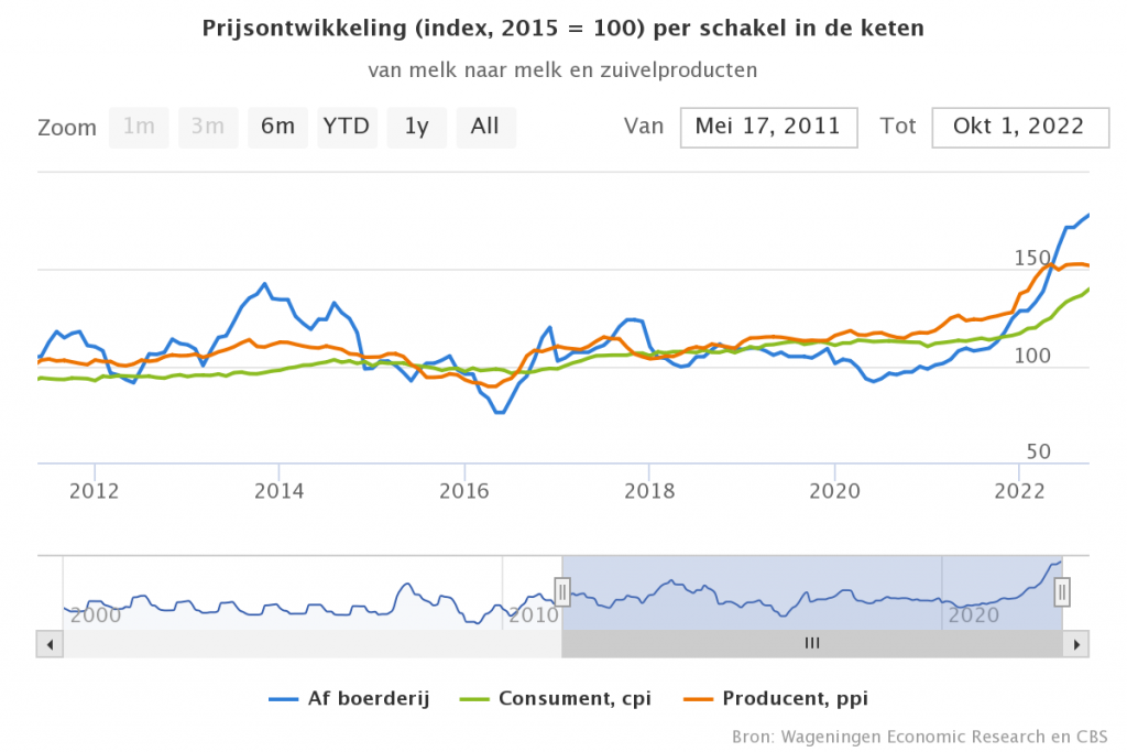 De consumentenprijsindex van zuivel is in september 2022 doorgestegen naar 137 punten (2015 =100). De producentenprijsindex voor zuivel staat op 153 punten. De prijsindex af boerderij heeft een niveau van 175 punten bereikt. De zuivelprijzen zijn ongekend hoog.