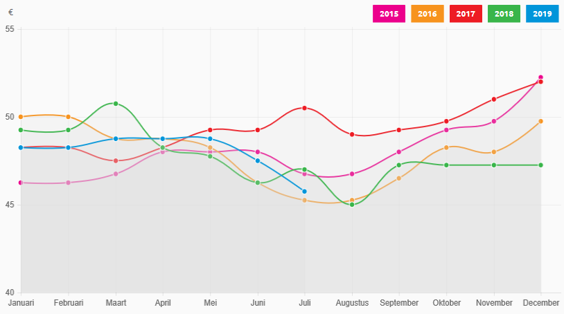 De biologische garantieprijs daalt 1,75 euro ten opzichte van de prijs van vorige maand (47,25 euro), dit inclusief een neerwaartse correctie van 1,74 euro.