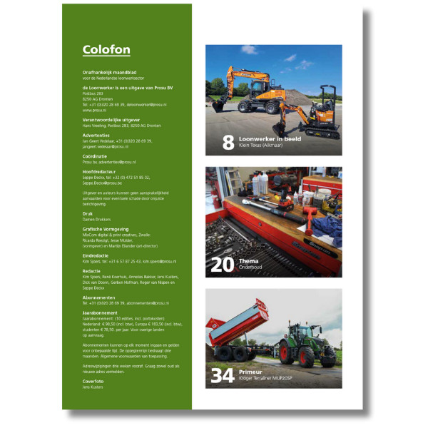 Met een abonnement op de Loonwerker en Melkveebedrijf worden vakblad De Loonwerker behandelt vaktechniek, gebruikerservaringen en visies van fabrikanten en collega’s in terugkerende rubrieken zoals ‘Machines in de kijker’ en ‘Loonwerker in beeld’. Het beschrijft de laatste ontwikkelingen in trends van de sector waarmee het een onmisbaar vakblad is voor de agrarische loonwerker.