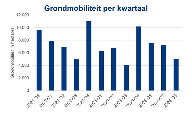 In het derde kwartaal van 2024 is 5.000 hectare landbouwgrond verhandeld, 900 hectare (22%) meer dan in hetzelfde kwartaal van 2023. Gemeten over de laatste vier kwartalen is in totaal 30.000 hectare grond in andere handen overgegaan. Dat is 1.800 ha (6,4%) meer dan in dezelfde periode een jaar eerder.