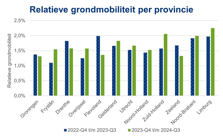 De relatieve grondmobiliteit – het verhandelde areaal afgezet tegen het totaal areaal landbouwgrond – varieert over de 4 laatste kwartalen van 1,31 procent in Groningen tot 2,25 procent in Limburg. In vergelijking met een jaar eerder is de relatieve grondmobiliteit het sterkst gedaald in Flevoland en Zeeland met respectievelijk 0,6 en 0,4 procentpunt, en het sterkst gestegen in Friesland en Zuid-Holland, met 0,4 en 0,5 procentpunt.