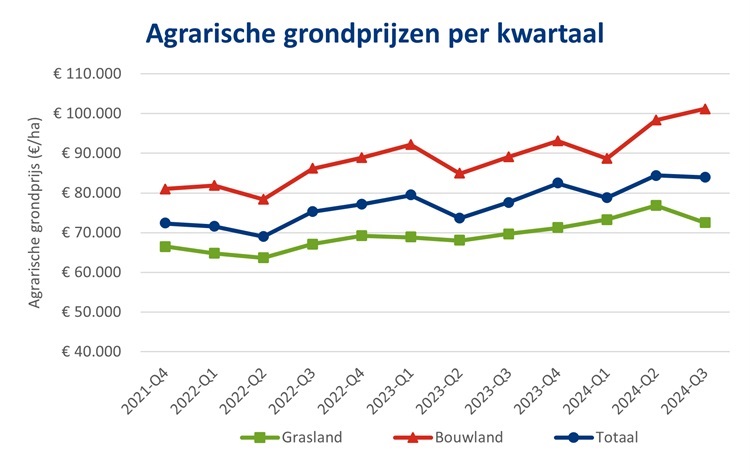 De gemiddelde prijs van grasland is in het derde kwartaal van 2024 met 5,6 procent gedaald tot 72.500 euro per hectare. Dat is 4,5 procent boven de gemiddelde prijs van grasland in 2023 van 69.400 euro per hectare. De gemiddelde prijs van snijmaisland is met 2,2 procent gestegen tot 83.200 euro. De prijs van dit grondgebruik is niet afzonderlijk in de onderstaande grafiek opgenomen, maar is wel onderdeel van het totaalcijfer van landbouwgrond.
