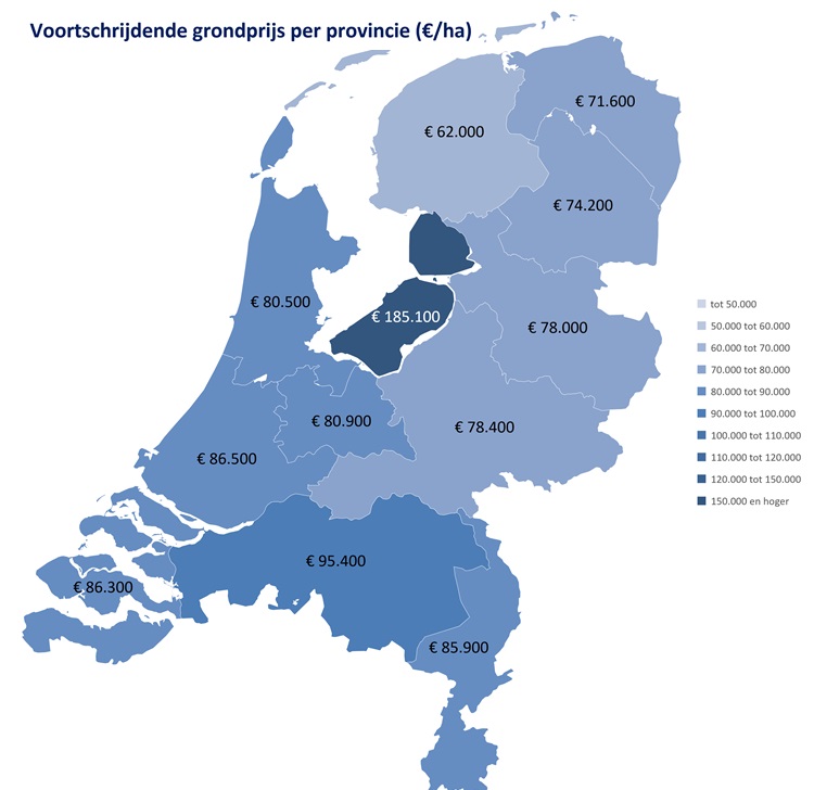 In de provincies Zuid-Holland en Noord-Holland is de gemiddelde agrarische grondprijs heel licht (minder dan 1%) gestegen. Terwijl de grondprijs in Utrecht met twee procent is gedaald. De provincies Noord-Brabant en Zeeland kenden een stijging van respectievelijk één en drie procent. In Limburg bleef de grondprijs gelijk.