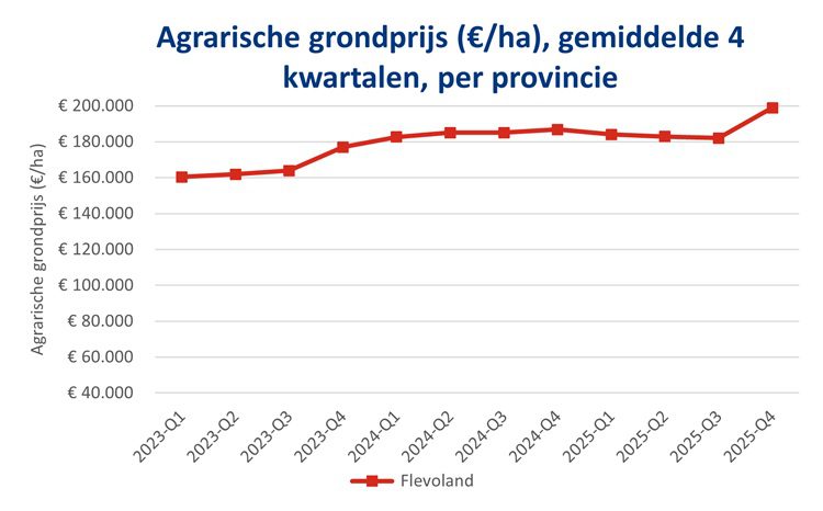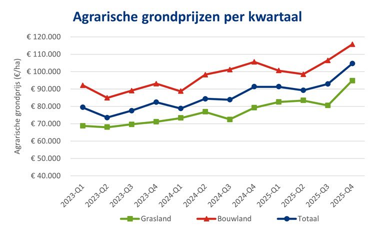 De prijs van agrarische grond in Nederland is in het vierde kwartaal van 2025 sterk gestegen. De prijs ging in één kwartaal omhoog met 12,7 procent. Dat is van 92.900 euro in het derde kwartaal naar 104.700 euro per hectare in het vierde kwartaal.