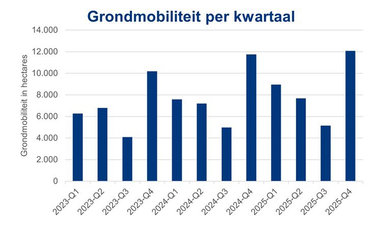 In het vierde kwartaal is 12.100 hectare landbouwgrond verhandeld. Dat is bijna 330 ha of 2,8 procent meer dan in hetzelfde kwartaal van 2024. In heel 2025 is 33.900 hectare grond verhandeld. Dat is 7,4 procent meer dan in 2024, toen 32.500 hectare is overgedragen