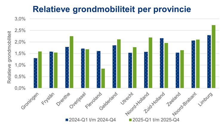 De relatieve grondmobiliteit varieert in 2025 van 0,85 procent in Flevoland tot 2,73 procent in Limburg. In vergelijking met één jaar eerder is de relatieve grondmobiliteit het sterkst gedaald in Flevoland en Zuid-Holland met 0,8 en 0,2 procentpunt. En het sterkst gestegen in Noord-Holland en Drenthe met 0,6 en 0,5 procentpunt.