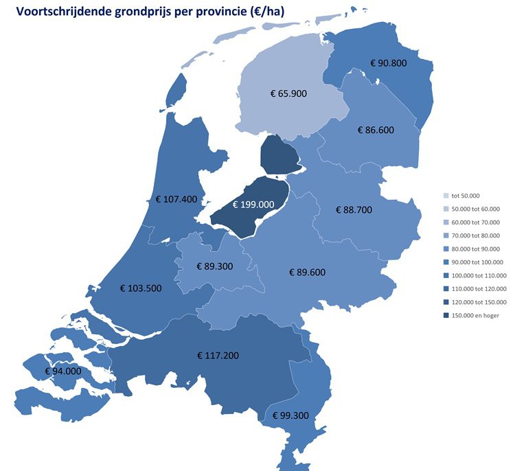 De landelijke agrarische grondprijs is in het vierde kwartaal met ruim 12 procent gestegen. Terwijl de grondprijs in de meeste provincies minder hard steeg. Of heel licht afnam, zoals in Zeeland. De reden is dat de provinciale kwartaalprijzen zijn berekend als het voortschrijdende gemiddelde over vier kwartalen. Terwijl de landelijke kwartaalprijs de daadwerkelijke prijs van het kwartaal is. Het provinciale voortschrijdende gemiddelde ijlt daardoor iets na op de landelijke kwartaalprijs-ontwikkeling.